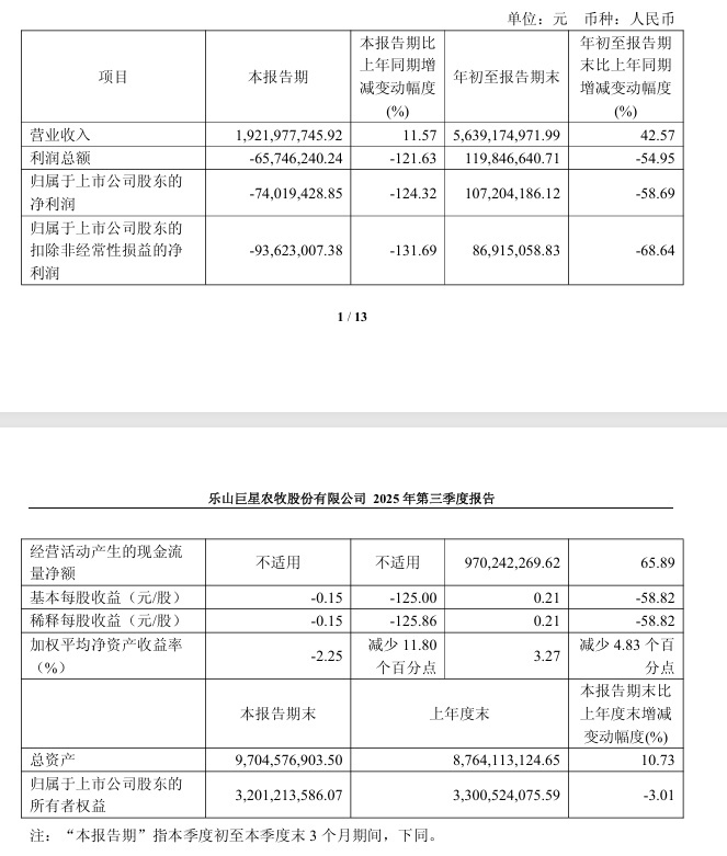 近期,巨星农牧发布公告,前三季度公司实现营业收入56.39亿元,同比增长42.57%;归属于上市公司股东的净利润1.07亿元,同比下降58.69%。其中,第三季度实现营收19.22亿元,同比增长11.57%;归属于上市公司股东的净利润-7401.94万元,同比下滑124.32%。