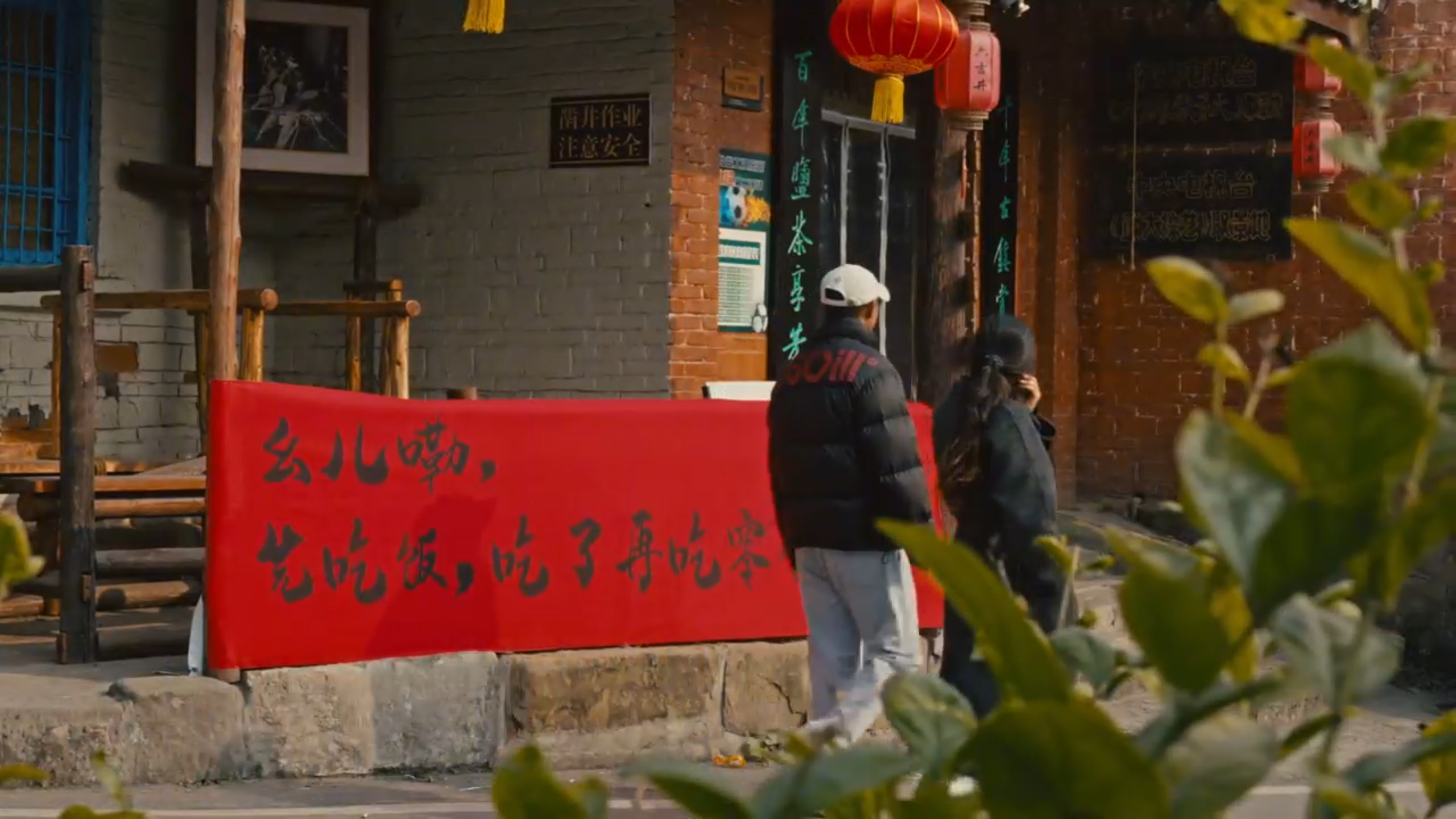 这些带着地道四川方言温度的话语,被悬挂在天宫堂、李子染扎染工坊、码头茶馆、美食小店等地标建筑上。古镇的砖墙青瓦,瞬间变成了一个巨型的、露天的“家庭微信群”,每一幅标语都是一条置顶的“语音消息”。